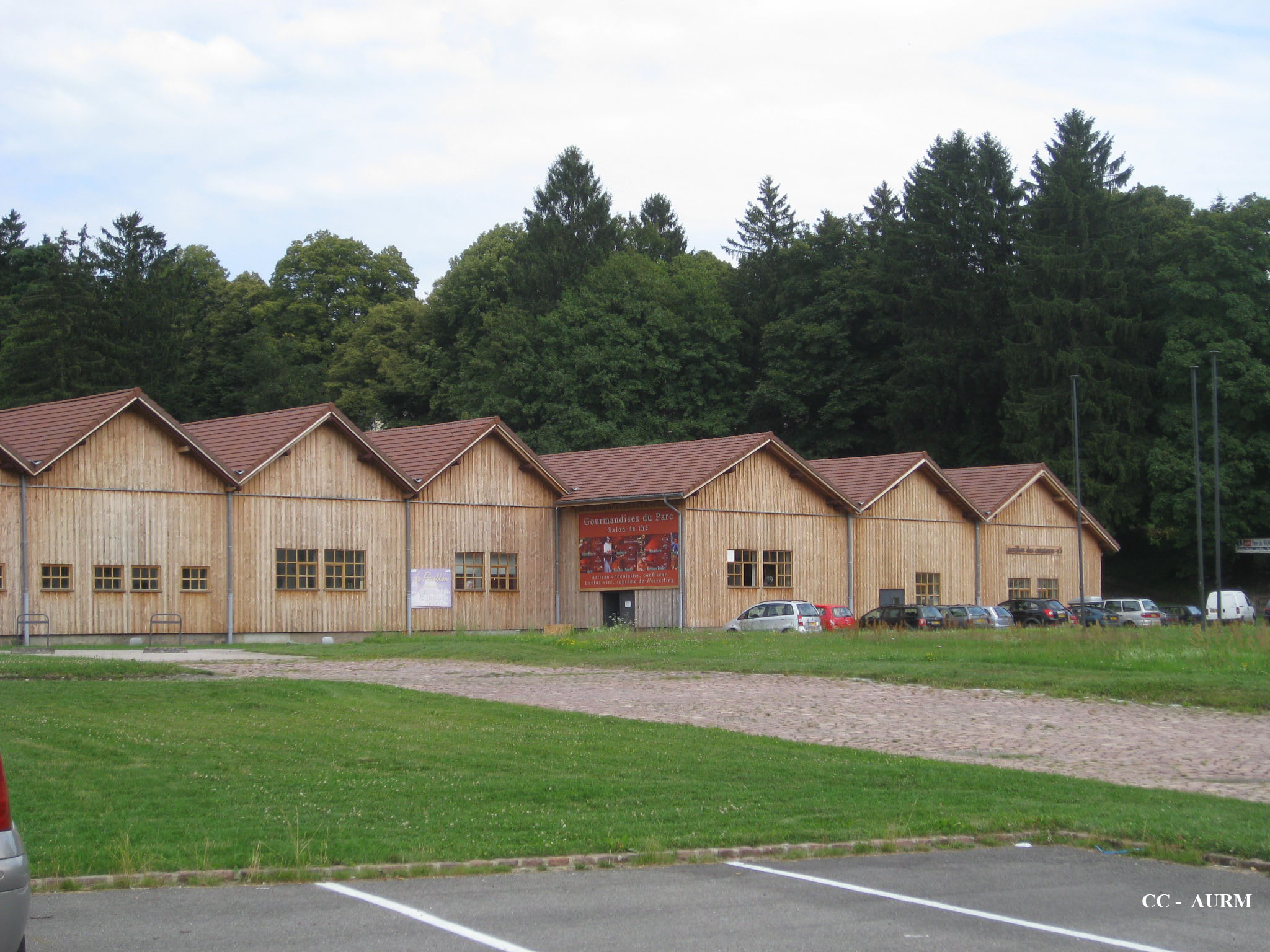 bâtiment en bois. arbre. gazon. parking.