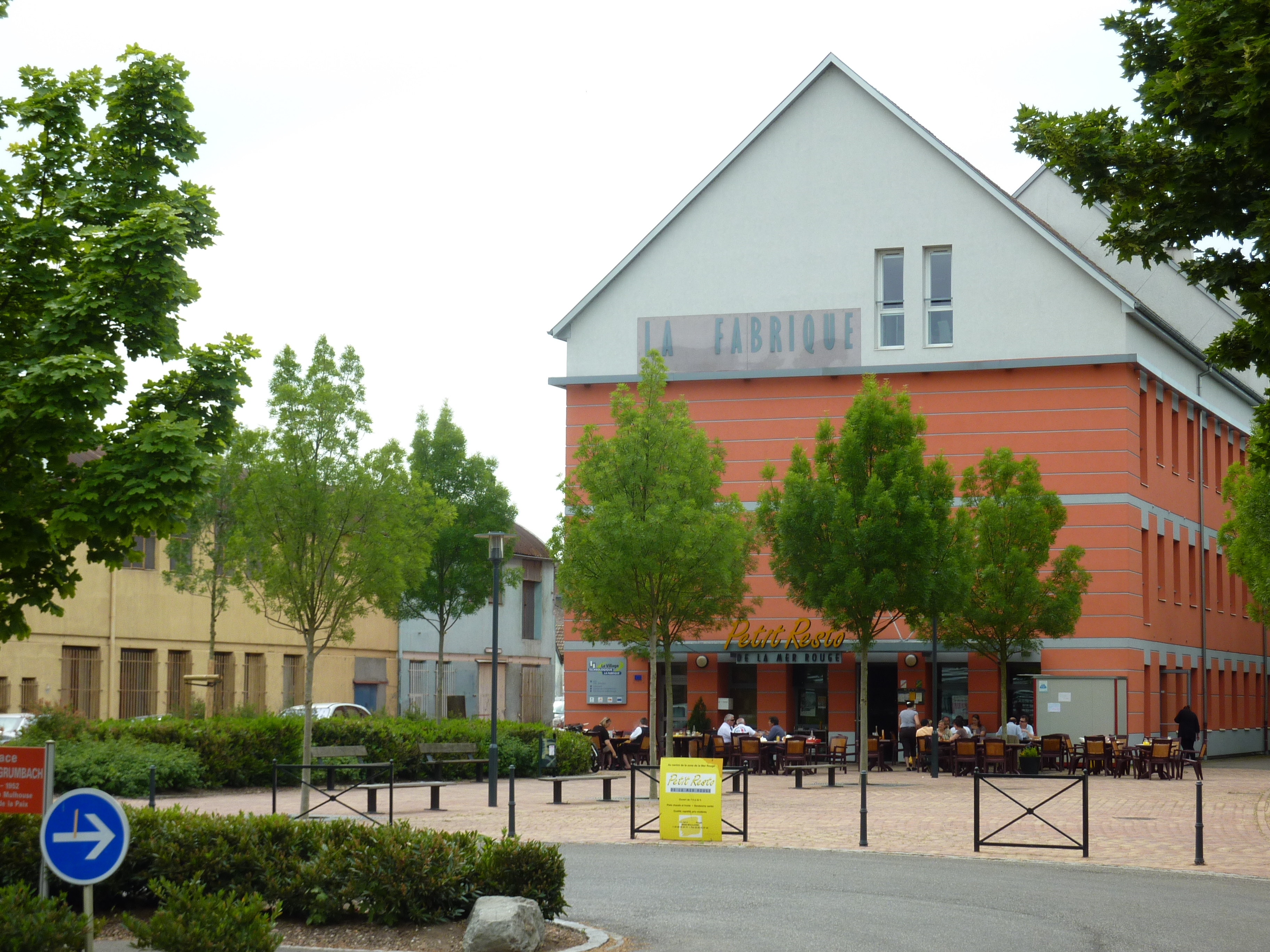 Bâtiment réhabilité. Rond point. Place.