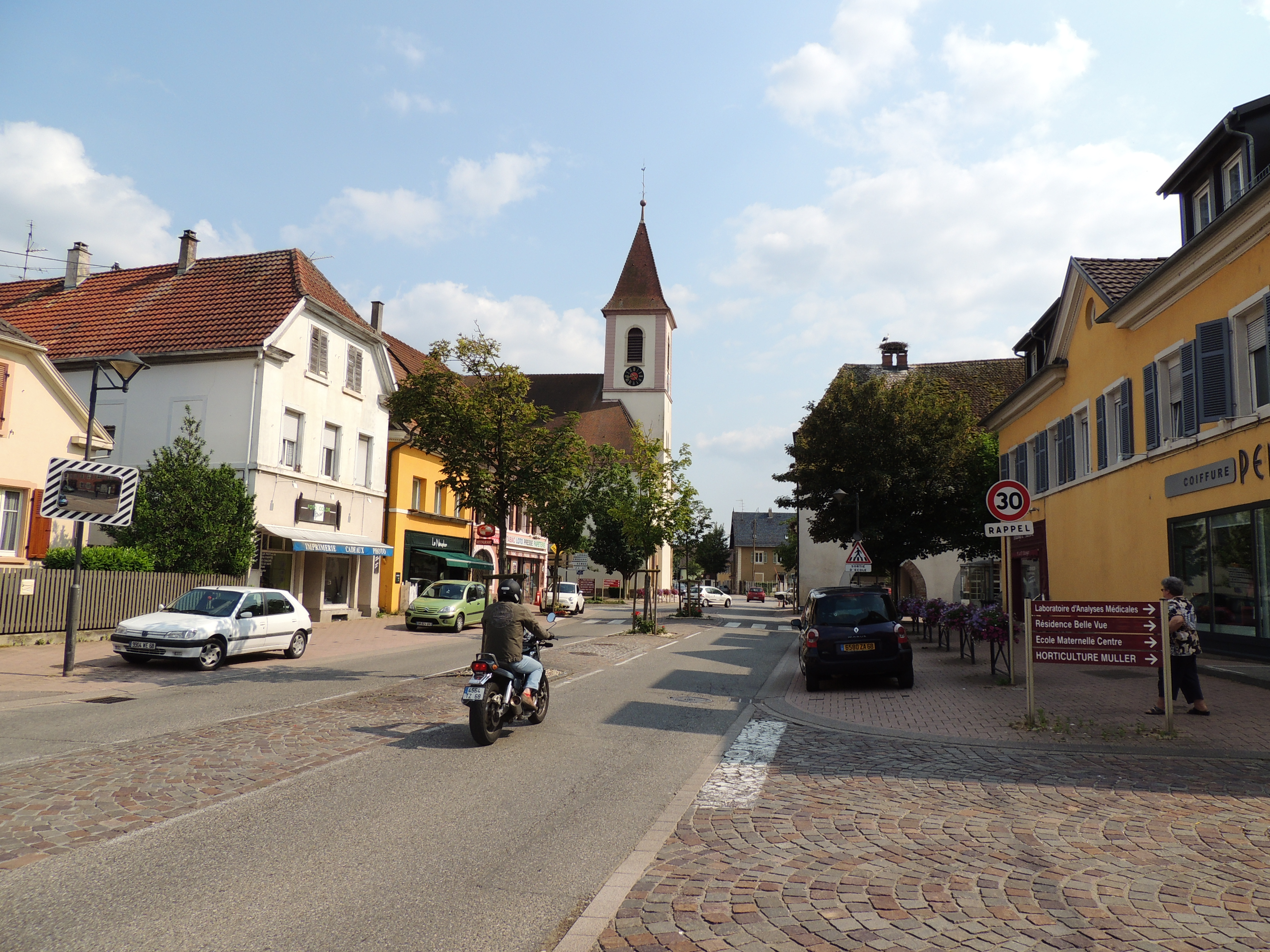 Moto. Piéton. Eglise. Commerce. Voiture.