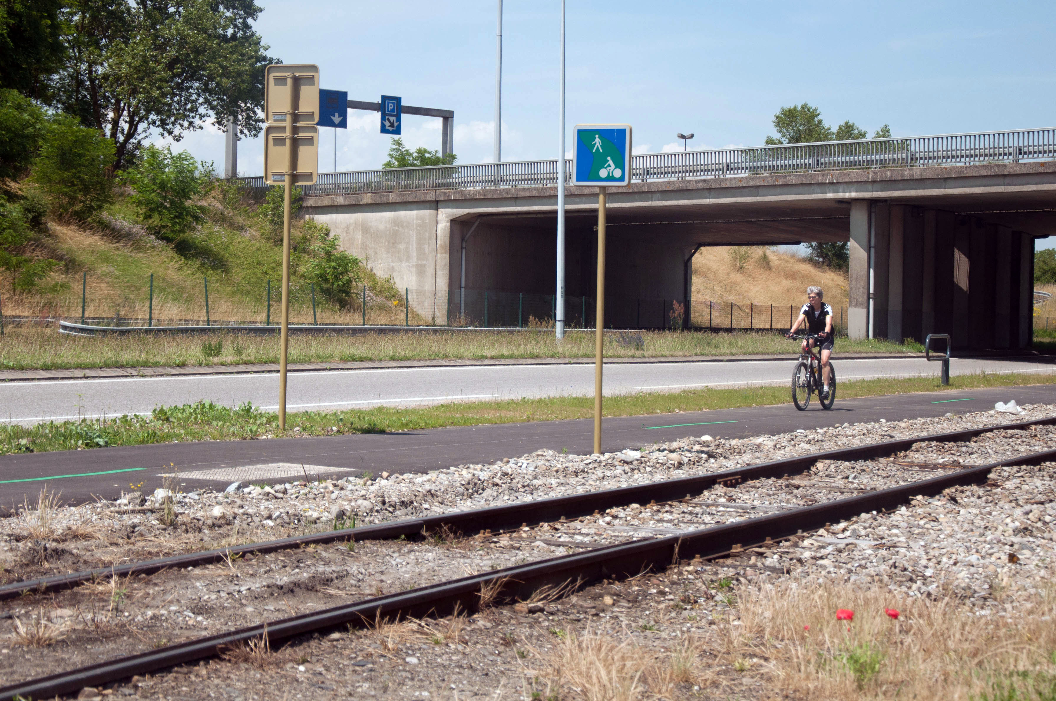 Piste cyclable. Cycliste. Vélo. Rail. Panneau.