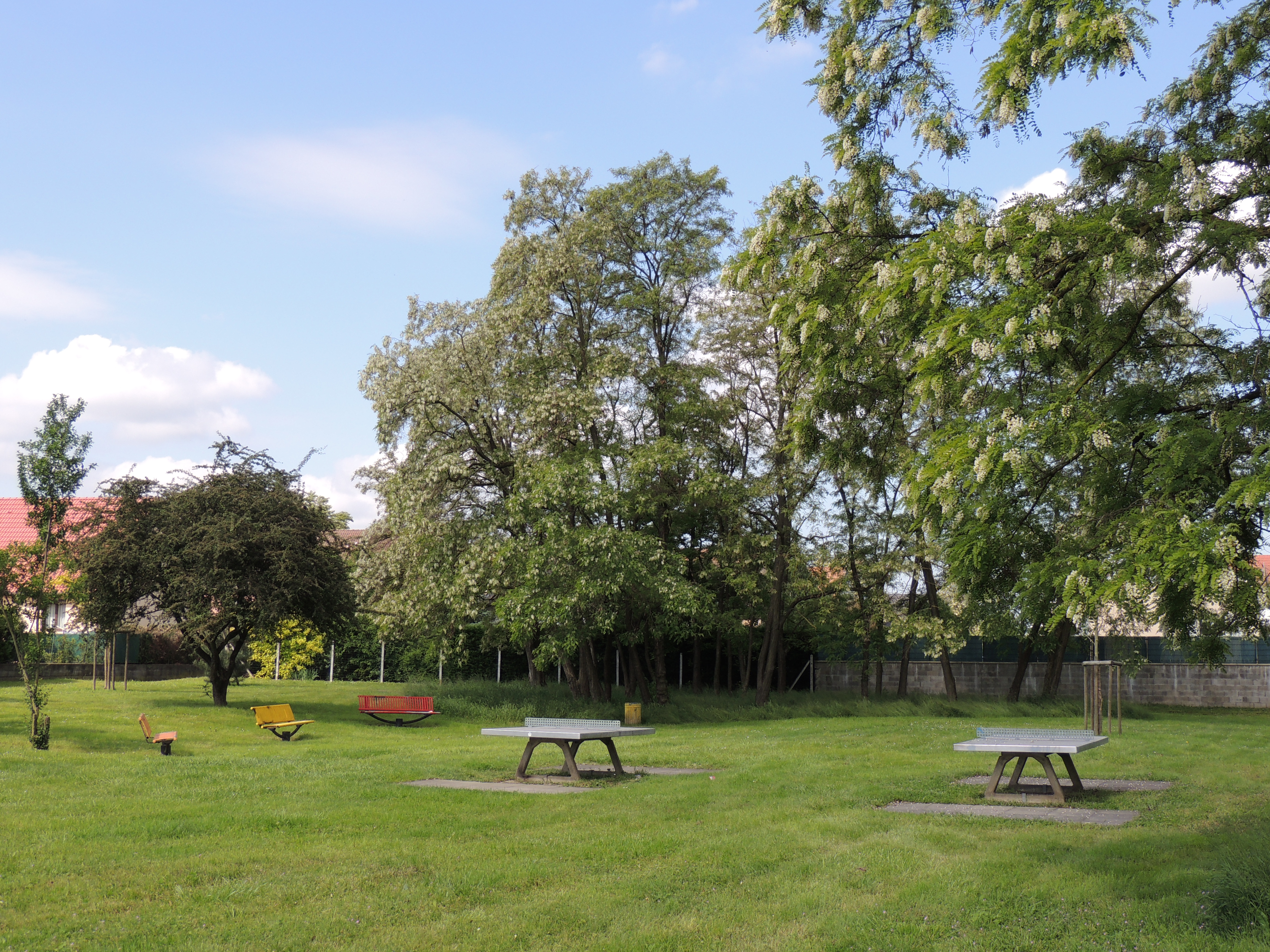 Parc. Arbre. Table de ping-pong. Banc.