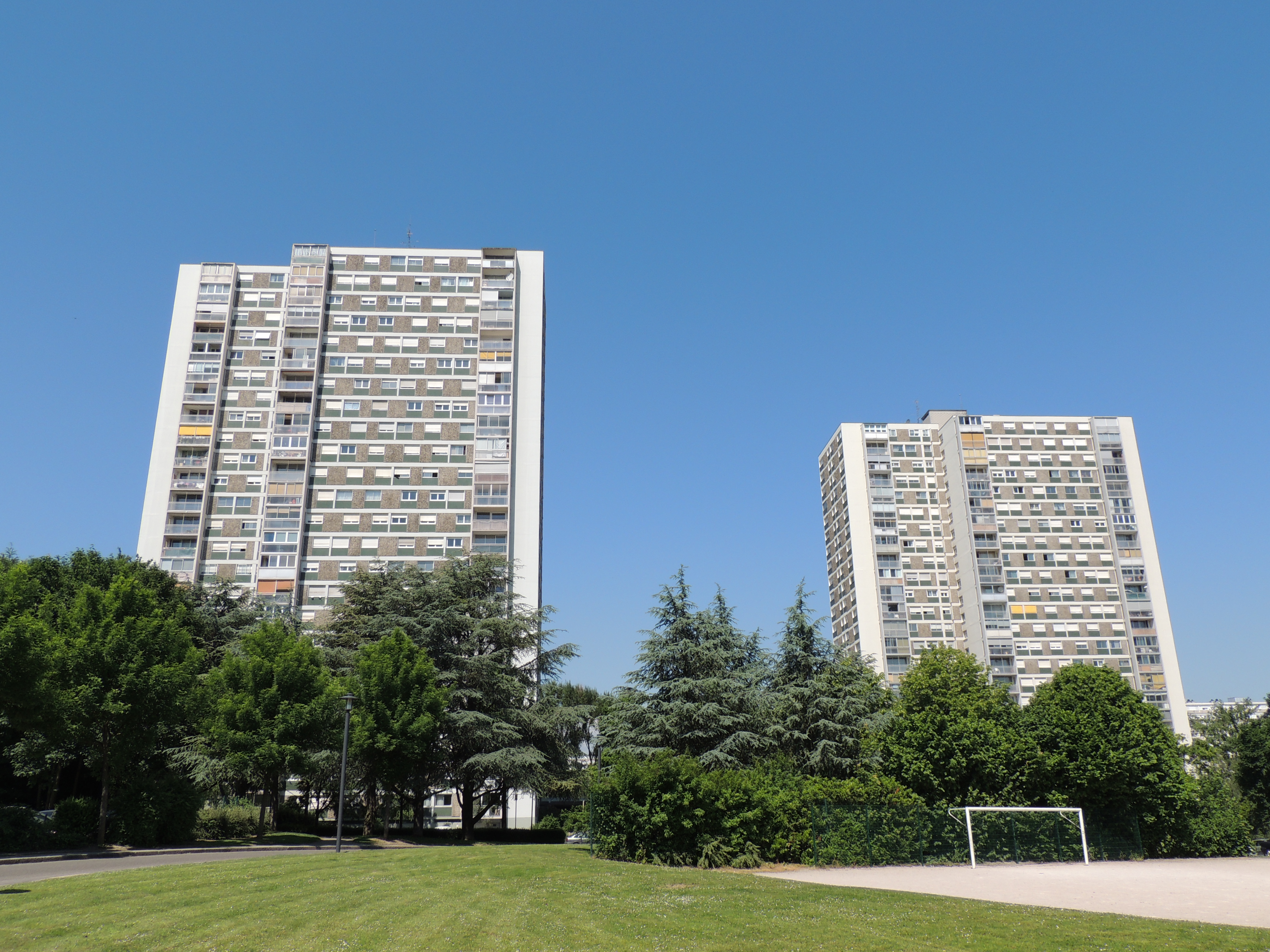 Immeuble. Pelouse. Stade.