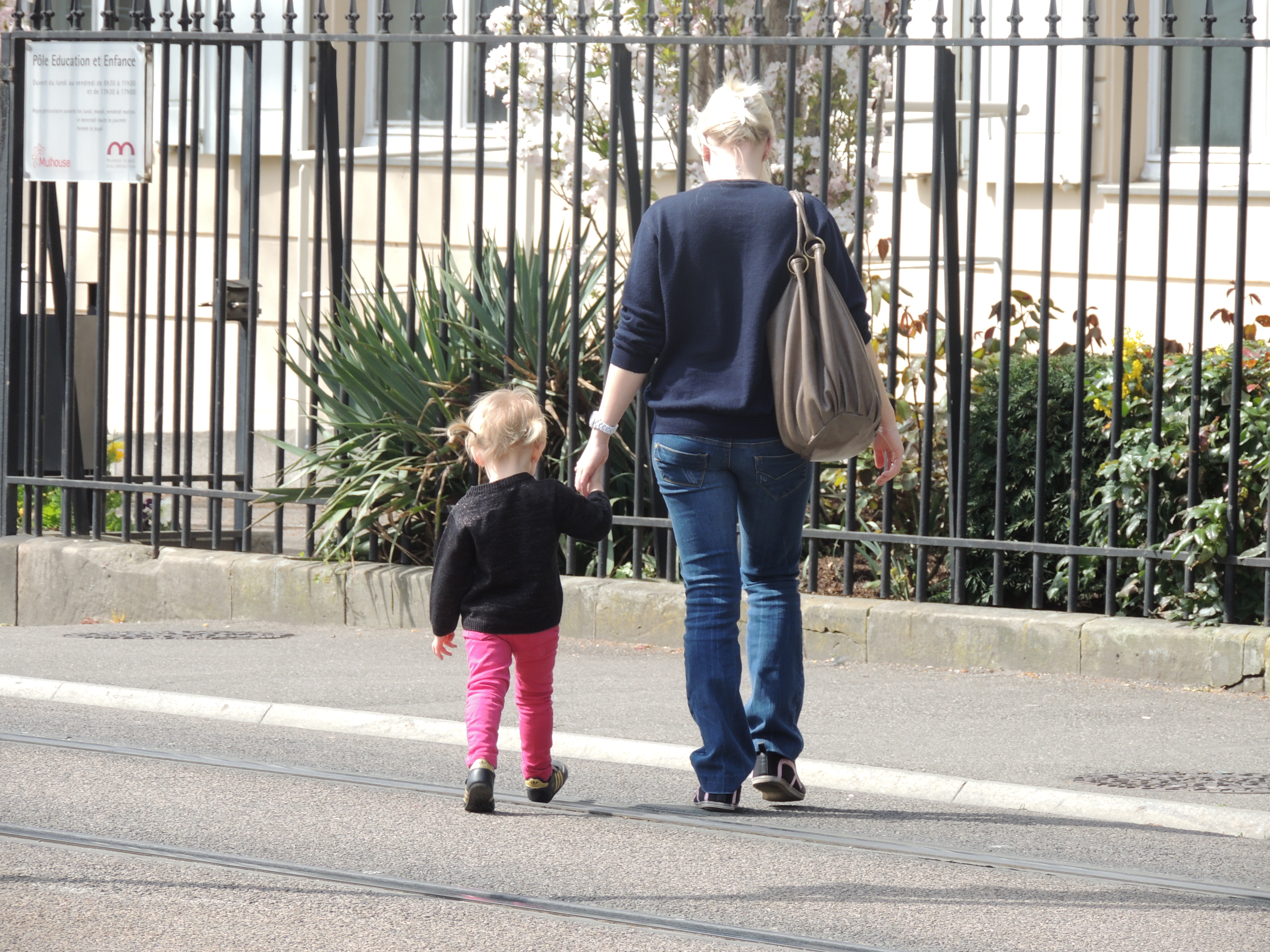 Femme et enfant traversant l'avenue du président Kennedy.
