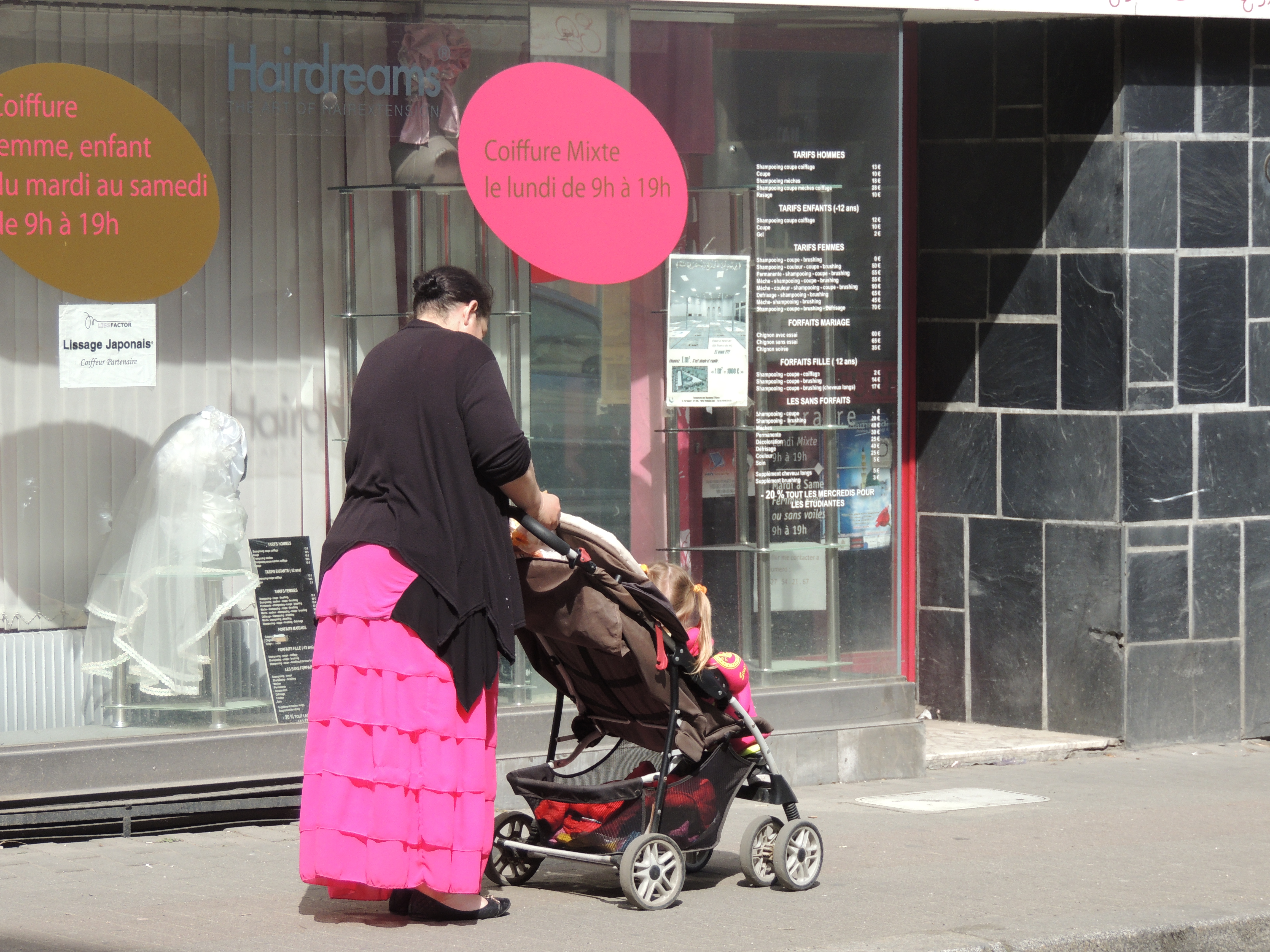Femme et enfant en poussette se déplaçant en ville.
