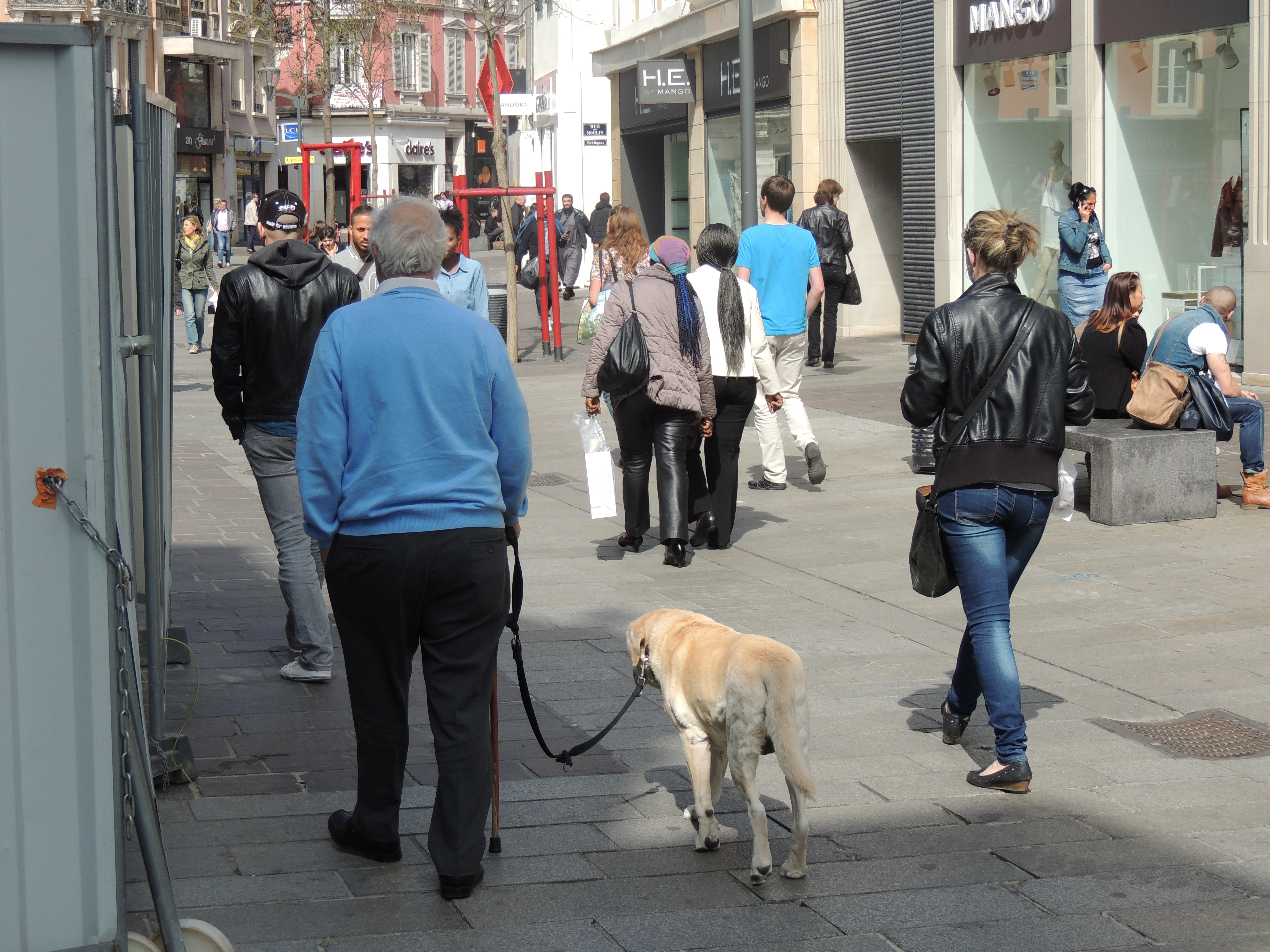 Homme sénior se déplaçant avec son chien rue du sauvage. Photographié de dos.