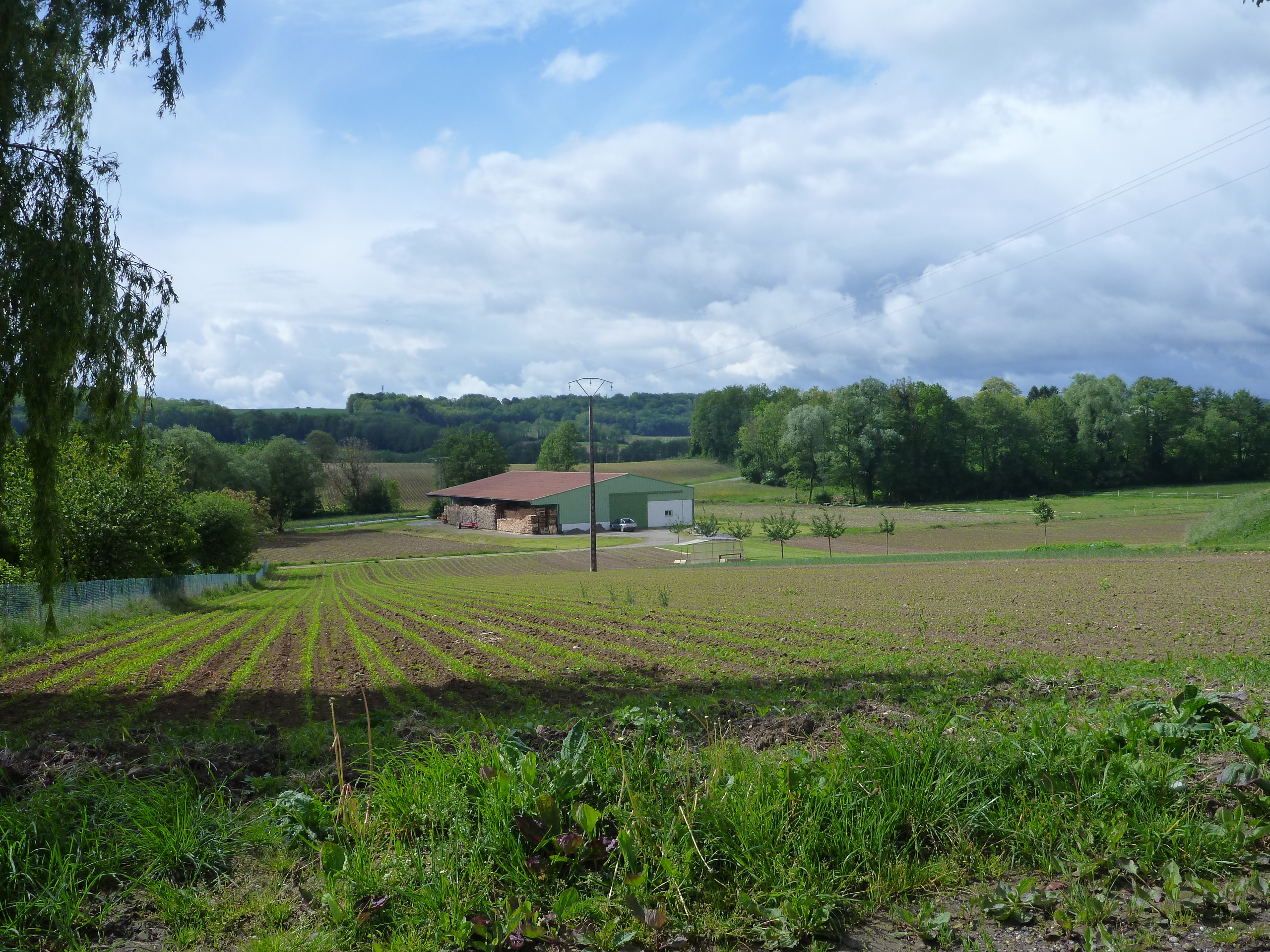Champ avec en contrebas un hangar.